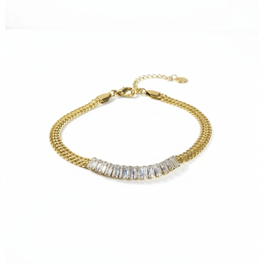 Introducing our elegant anti-tarnish 18k gold-plated stainless steel bracelet, a perfect harmony of sophistication and durability. Featuring sparkling baguette-cut crystals that gracefully accent a chic flat link chain, this bracelet elevates any outfit while providing a timeless charm.