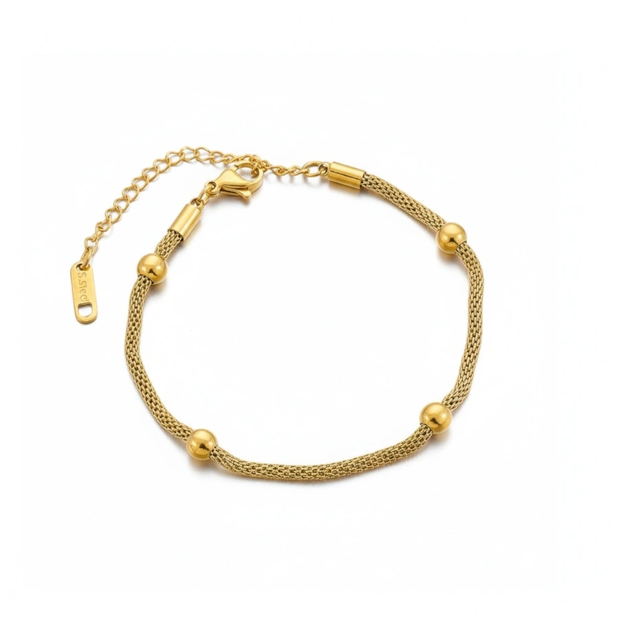 This anti-tarnish 18k gold-plated 304 stainless steel bracelet features a chic mesh chain accented with polished gold beads, offering a durable and minimalist accessory for daily wear.