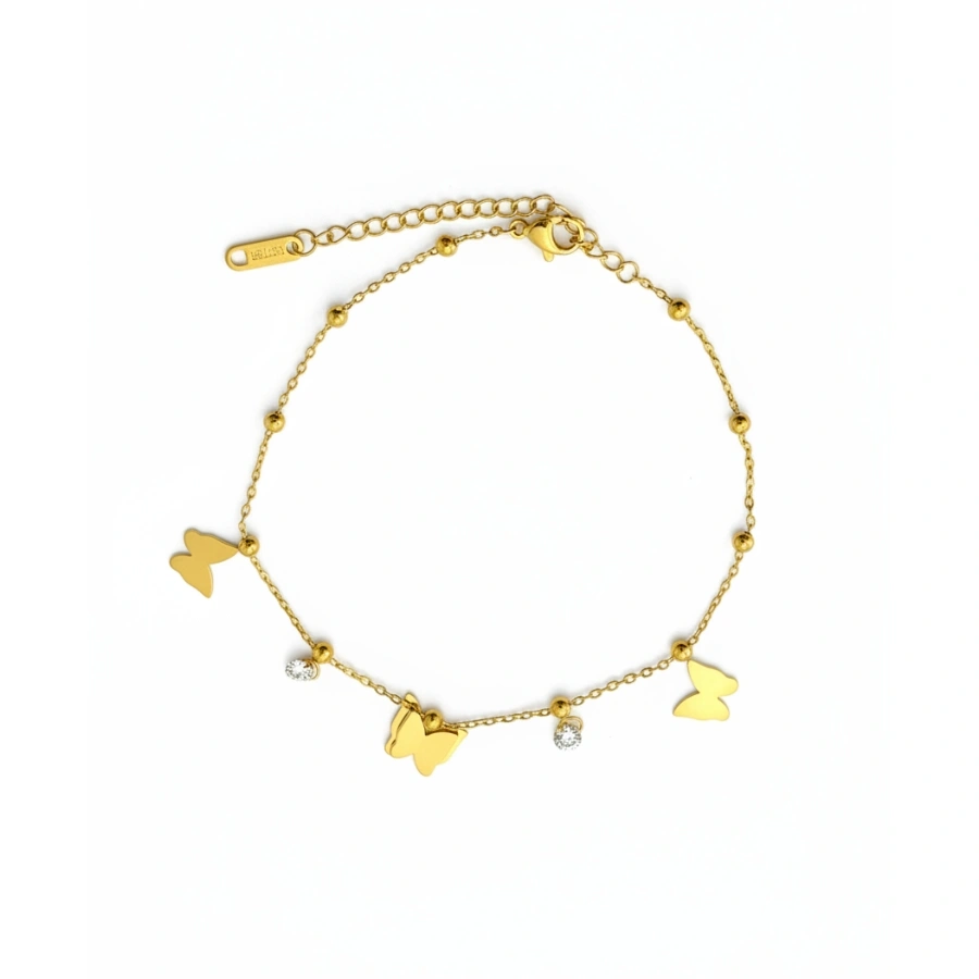 Elegant anti-tarnish 18k gold-plated stainless steel butterfly anklet featuring sparkling crystal accents and a delicate beaded chain for a durable, waterproof look.