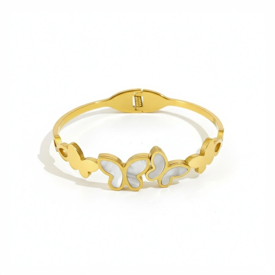 Elegant anti-tarnish 18k gold-plated stainless steel butterfly bangle with mother-of-pearl inlays for a waterproof, hypoallergenic, and feminine luxury look.