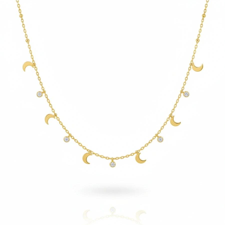 Bask in the allure of celestial-inspired elegance with our anti-tarnish 18k gold-plated stainless steel necklace. Thoughtfully crafted to complement any outfit, this necklace boasts exquisite crescent moon charms paired with shimmering crystal stations, making it a must-have addition to your jewelry collection.