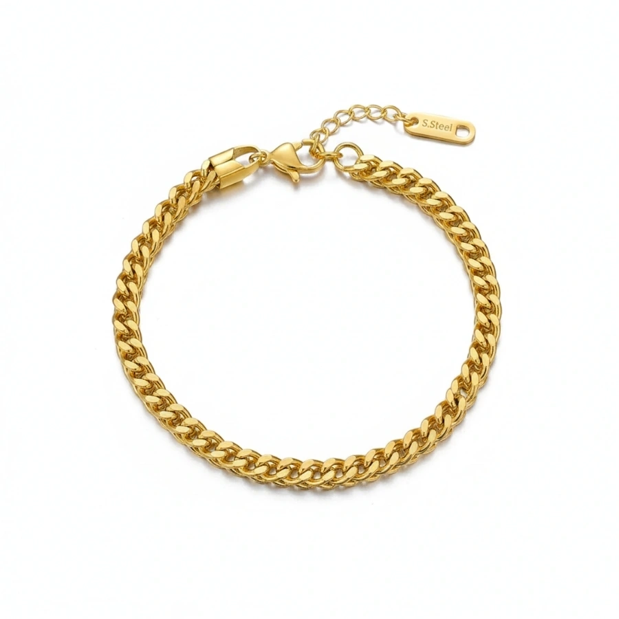 Durable anti-tarnish 18k gold-plated stainless steel 4mm curb chain bracelet for a waterproof, hypoallergenic, and timeless everyday jewelry statement.
