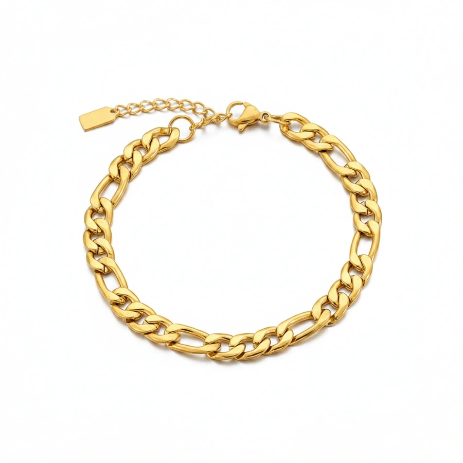 This timeless anti-tarnish 18k gold-plated 304 stainless steel bracelet features a bold Figaro link design, offering a durable and stylish accessory for any outfit.
