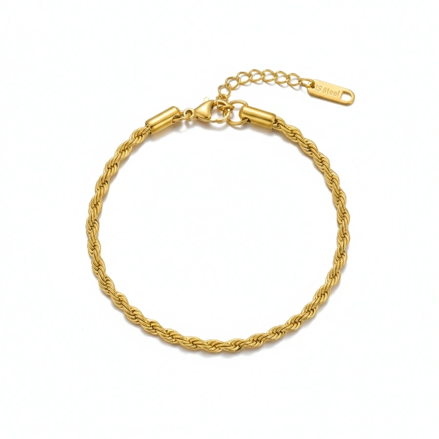 Elegant anti-tarnish 18k gold-plated stainless steel rope link bracelet for a waterproof, hypoallergenic, and timeless everyday jewelry look.