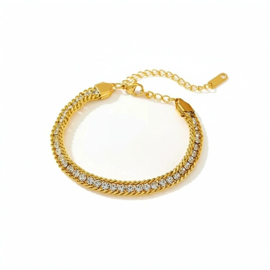 Elegant anti-tarnish 18k gold-plated stainless steel bracelet featuring sparkling clear zircons on a wheat chain for a waterproof, hypoallergenic, and luxurious everyday look.