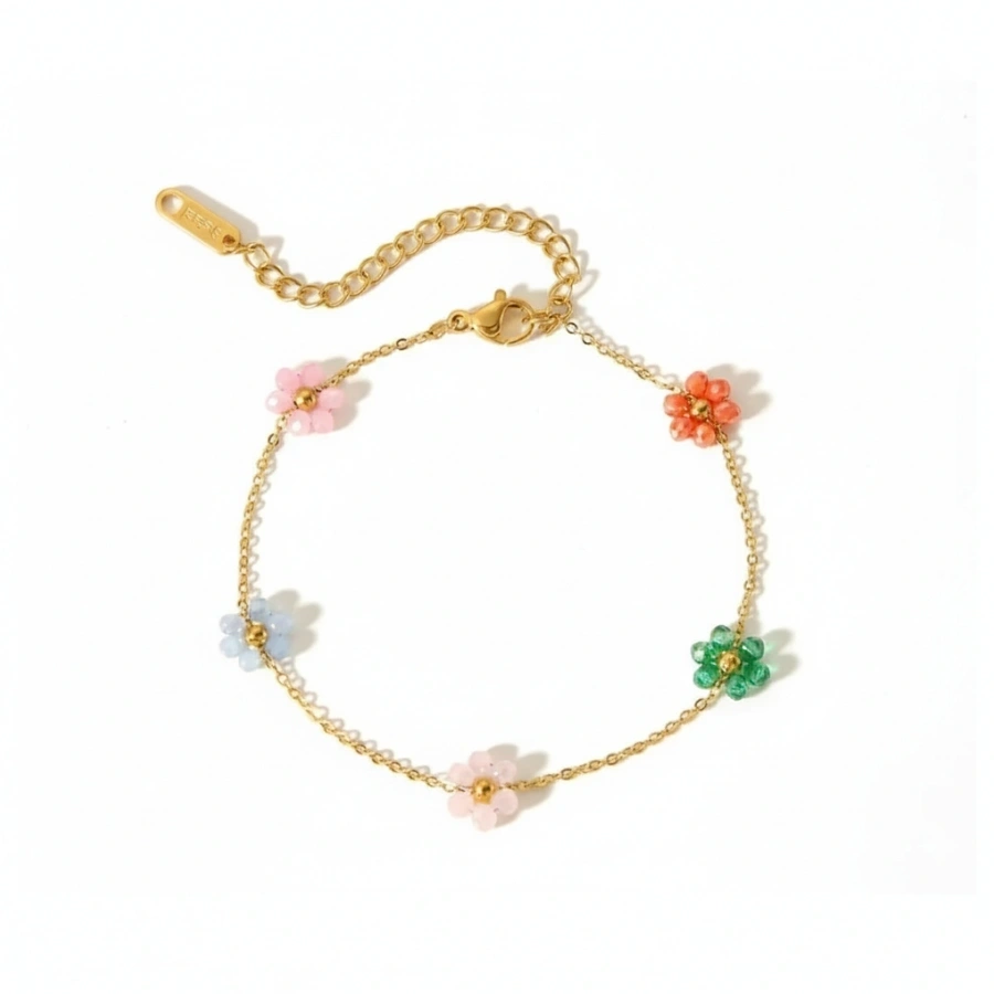 Charming anti-tarnish 18k gold-plated stainless steel bracelet featuring vibrant beaded flower charms for a dainty, waterproof, and hypoallergenic floral accessory.