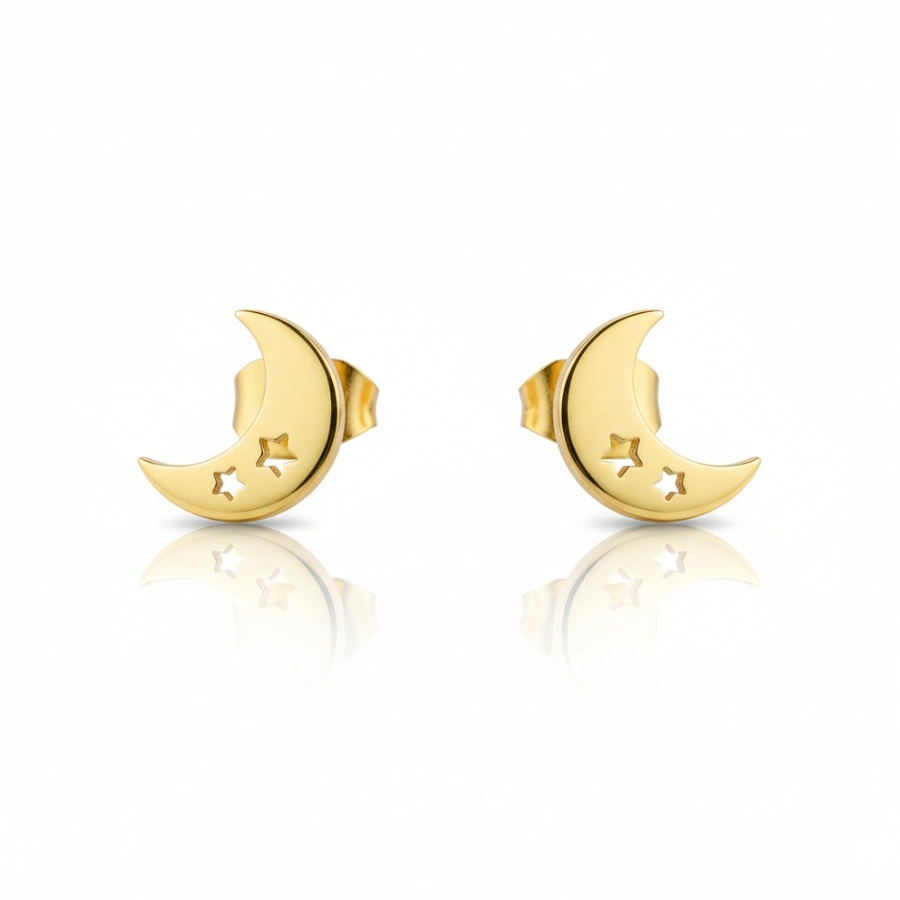 Dainty anti-tarnish 18k gold-plated stainless steel crescent moon earrings with star cutouts, offering a waterproof and hypoallergenic celestial style.
