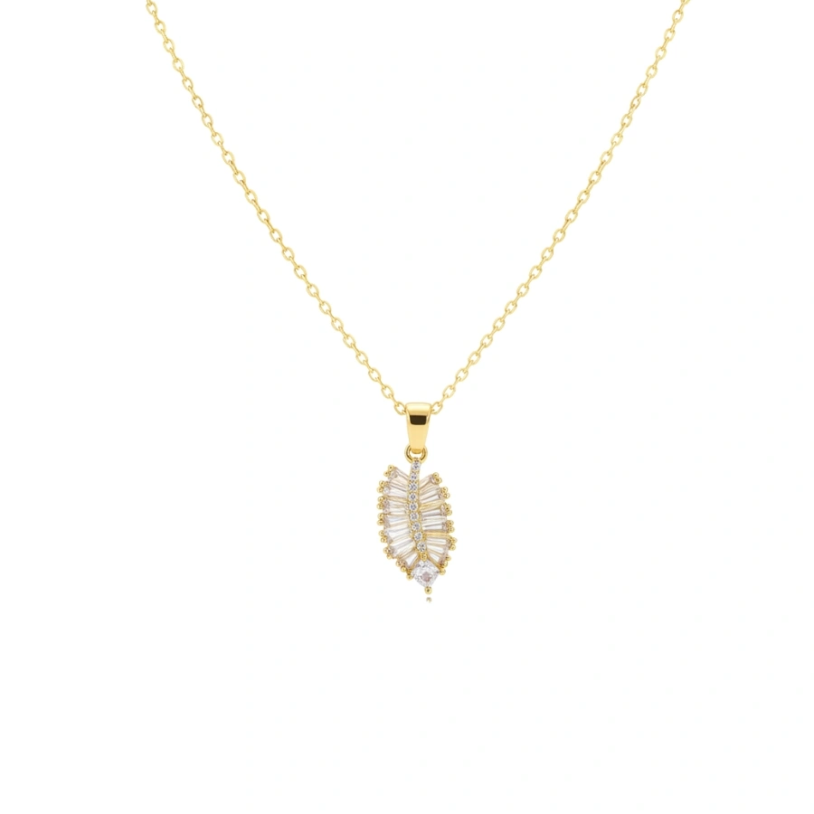 Add a touch of sophistication to your daily attire with our stunning 18k gold-plated stainless steel necklace. Featuring a delicately crafted leaf pendant, adorned with sparkling crystals, this piece is designed to elevate your style without compromising on durability. Its anti-tarnish finish ensures it retains its brilliant shine for years to come.
