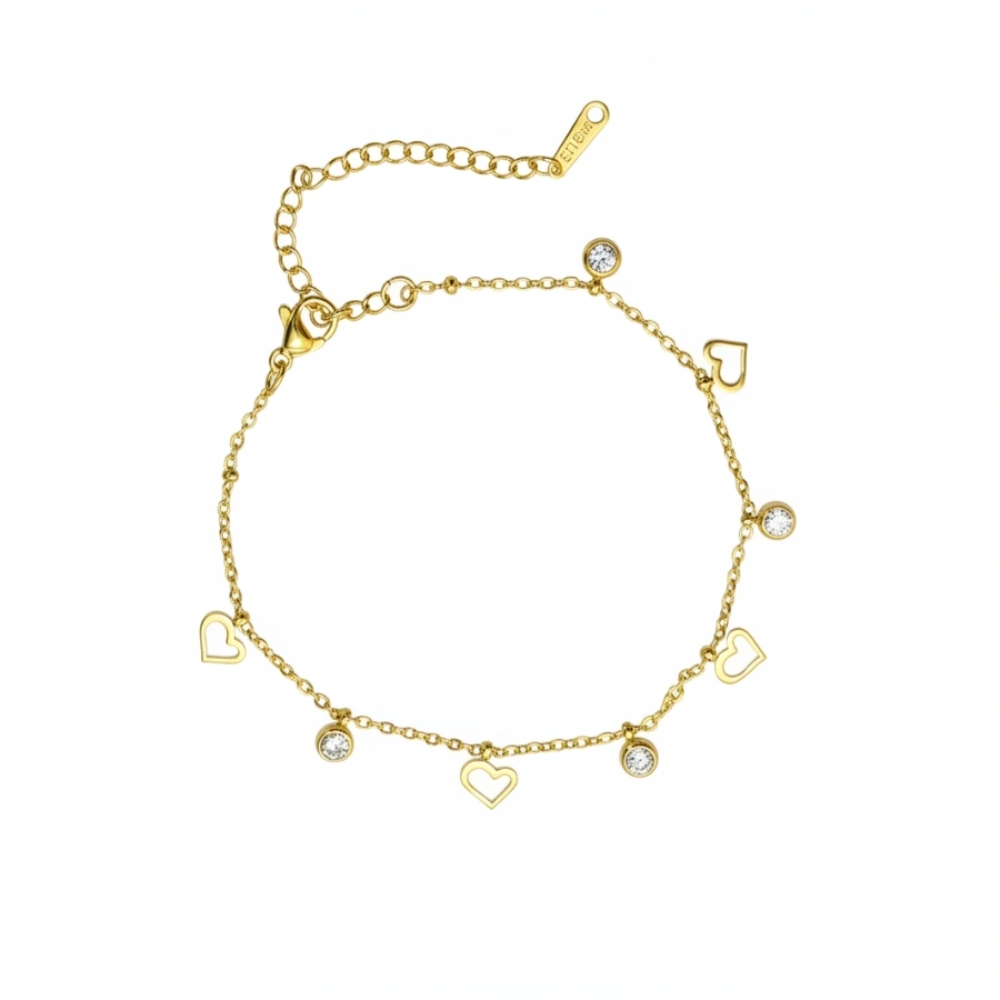 This elegant, anti-tarnish anklet is crafted from durable gold-plated stainless steel and features alternating open heart charms with sparkling bezel-set crystals.