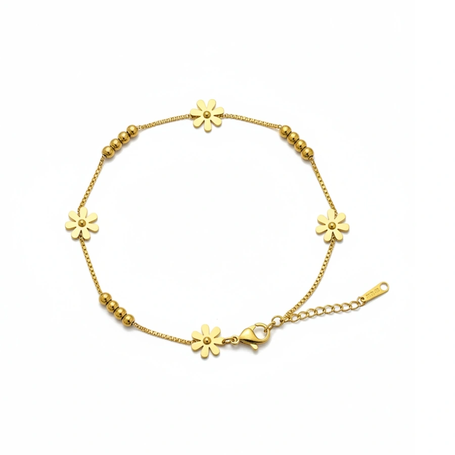 Elegant anti-tarnish 18k gold-plated stainless steel daisy anklet with dainty gold beads for a waterproof and tarnish-free minimalist look.