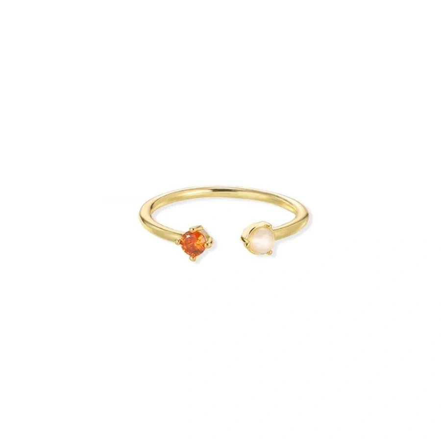 This elegant anti-tarnish 18k gold-plated 304 stainless steel adjustable ring features two dainty gemstones Orange Red, offering a durable and stylish minimalist look.