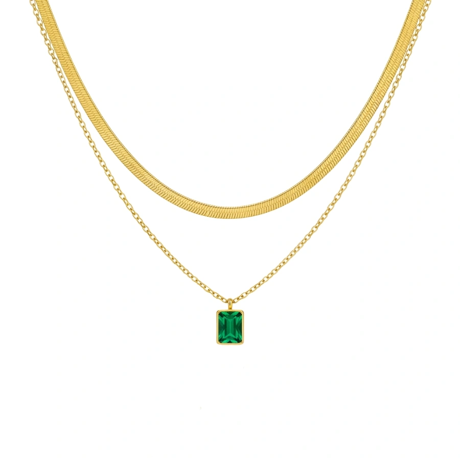 Discover how effortlessly sophistication can be added to your look with our anti-tarnish 18k gold-plated stainless steel layered necklace. Meticulously designed to exude charm, this jewelry piece features a sleek snake chain paired with a dazzling emerald green crystal pendant—a combination that radiates luxury and refinement.
