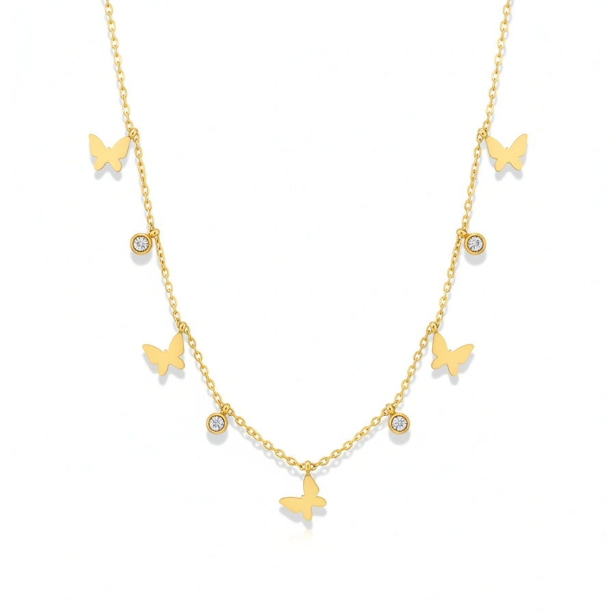 Add a whimsical touch to your everyday ensemble with our stunning 18k gold-plated stainless steel necklace. Designed with both style and durability in mind, this piece resists tarnishing, ensuring its radiant golden hue lasts season after season. The delicate butterfly charms, paired with sparkling crystal stations, bring a harmonious blend of grace and contemporary flair to your jewelry collection.