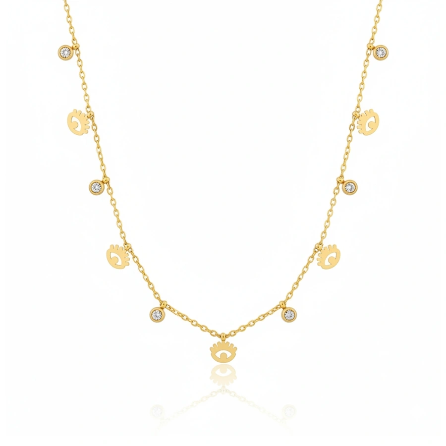 Discover the perfect blend of style and symbolism with this dainty 18k gold-plated stainless steel station necklace. Designed to elevate your everyday look, the necklace features alternating evil eye charms and glimmering clear crystals that exude both elegance and meaning. Whether you’re looking to accessorize your casual outfit or amp up your evening wear, this necklace makes a subtle yet striking statement.