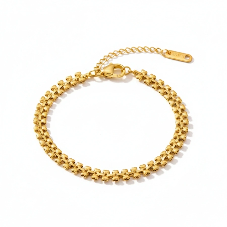 This chic anti-tarnish 18k gold-plated 316L stainless steel bracelet features intricate clover-shaped links, offering a durable and sophisticated minimalist look.