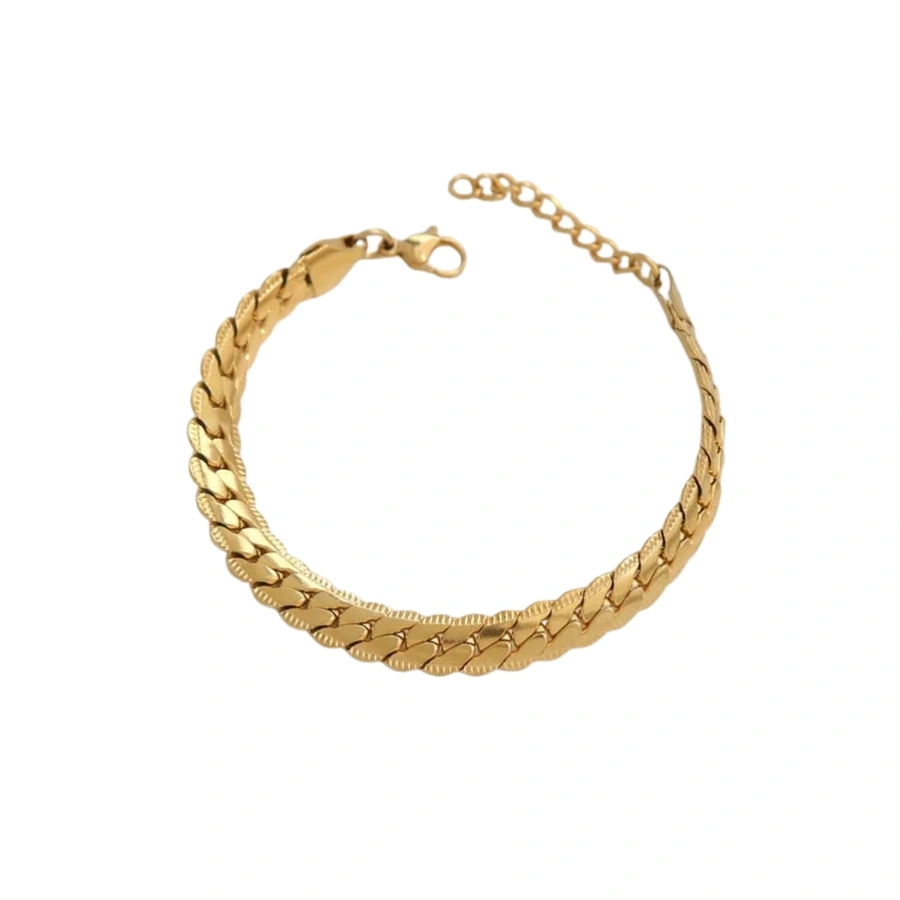 Premium anti-tarnish 18k gold-plated stainless steel bracelet featuring a bold flat curb link design for a waterproof, hypoallergenic, and timeless luxury statement.