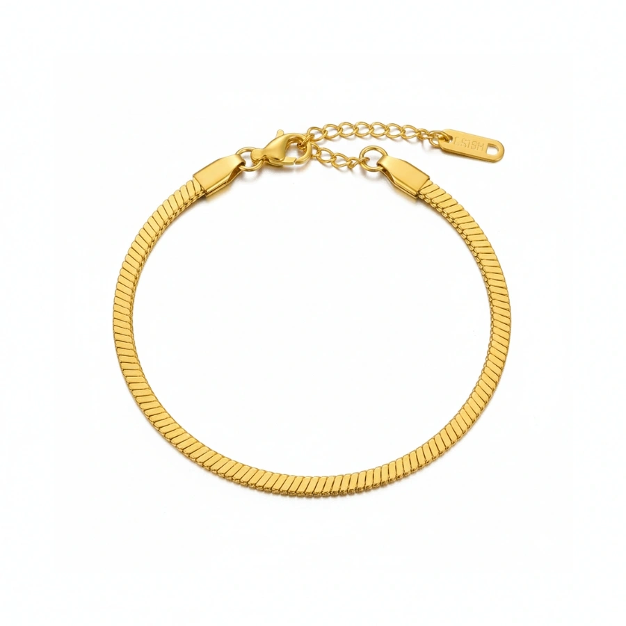 Sleek anti-tarnish 18k gold-plated stainless steel 3mm flat herringbone bracelet for a waterproof, hypoallergenic, and timeless minimalist statement.