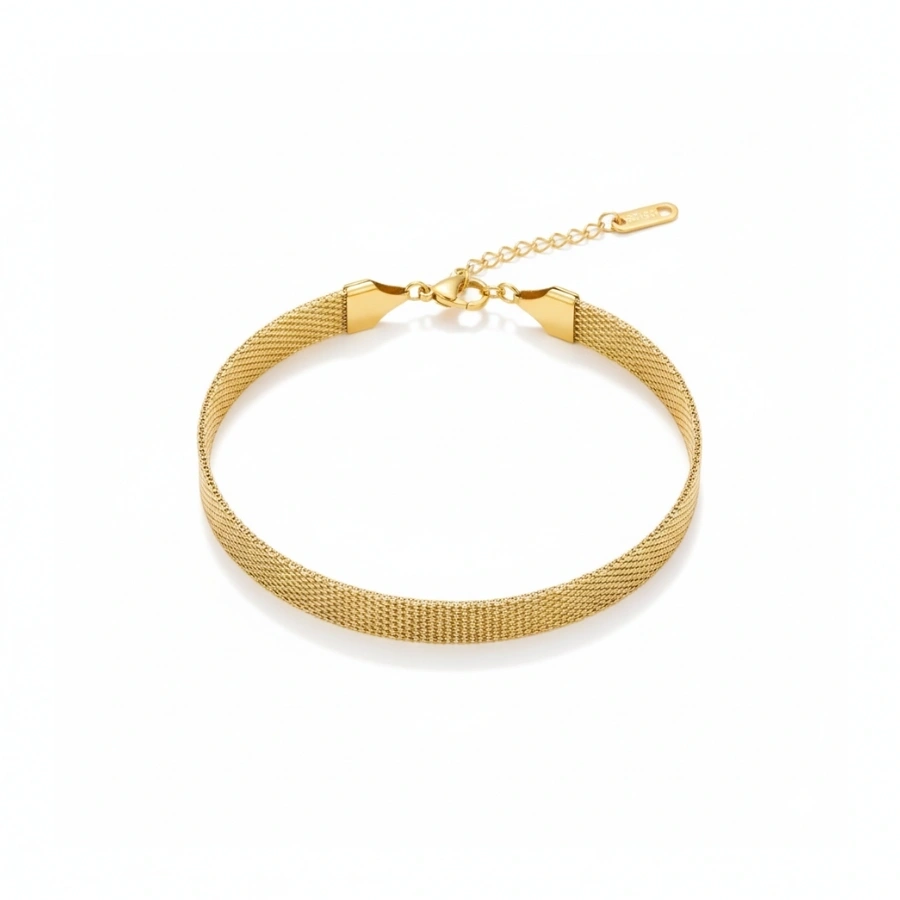 Elegant anti-tarnish 18k gold-plated stainless steel flat woven mesh chain bracelet for a waterproof, hypoallergenic, and sophisticated everyday luxury look.