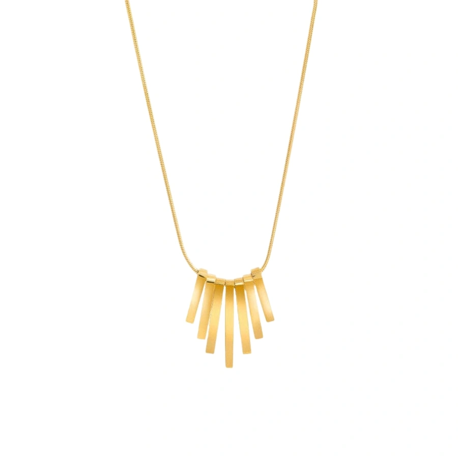 Elevate your everyday style with this stunning 18k gold-plated stainless steel necklace. Engineered to make a bold modern statement, this minimalist design features a unique geometric fringe of vertical bars, setting you apart with its sleek sophistication. Perfect for those who value both elegance and simplicity, this necklace is destined to be the centerpiece of your favorite looks.