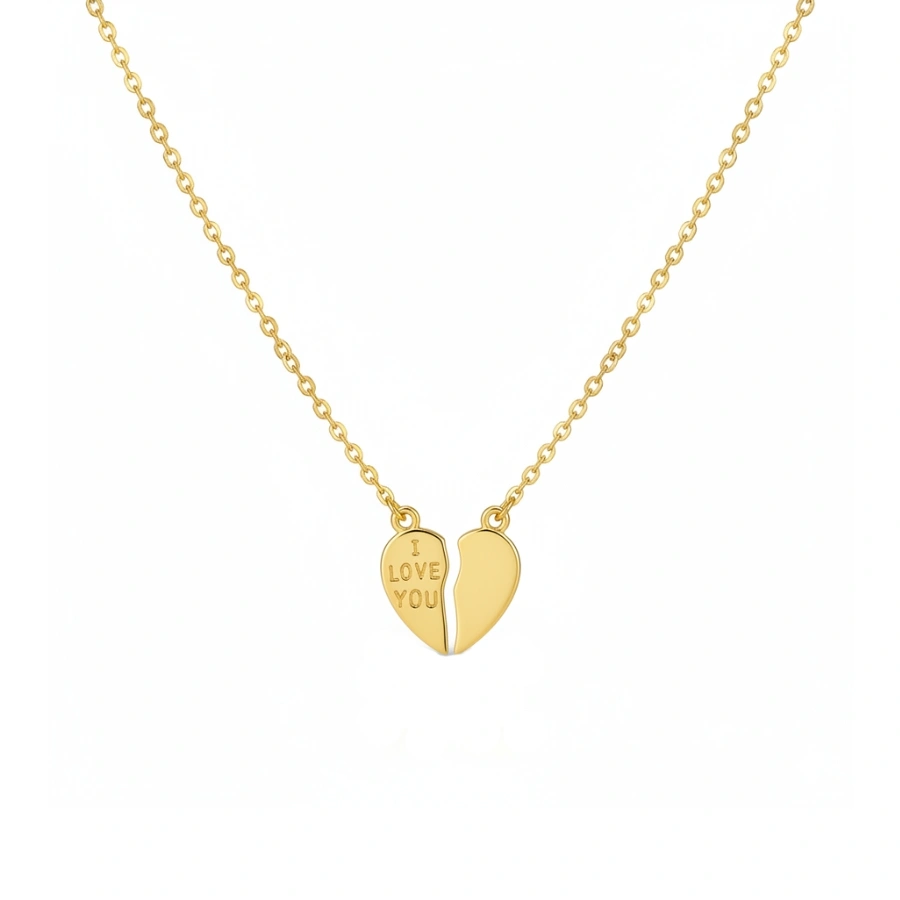 Show your special someone how much they mean to you with our stunning 18k gold-plated stainless steel split heart necklace set. Each piece elegantly complements the other, creating a sentimental keepsake perfect for couples. Featuring an “I Love You” engraving, this necklace set beautifully captures the essence of true affection and devotion.