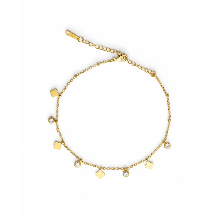 Featuring dainty four-leaf clovers and sparkling crystals on an anti-tarnish gold-plated stainless steel chain, this durable, waterproof piece offers a timeless blend of elegance and charm for any occasion.