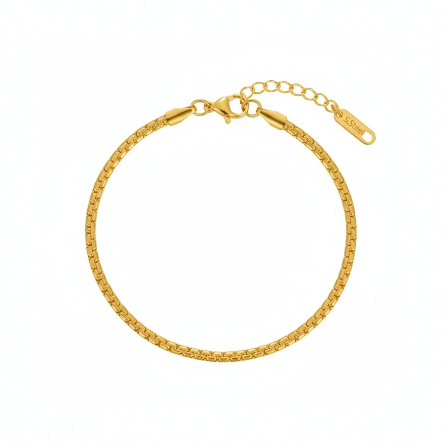 Elegant anti-tarnish 18k gold-plated stainless steel box link bracelet for a waterproof, hypoallergenic, and sophisticated everyday jewelry look.