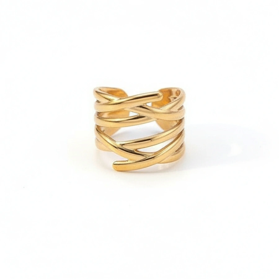 Make a bold statement with this adjustable anti-tarnish 18k gold-plated stainless steel ring, featuring a chic multi-layer crisscross design that is both waterproof and hypoallergenic for everyday wear.