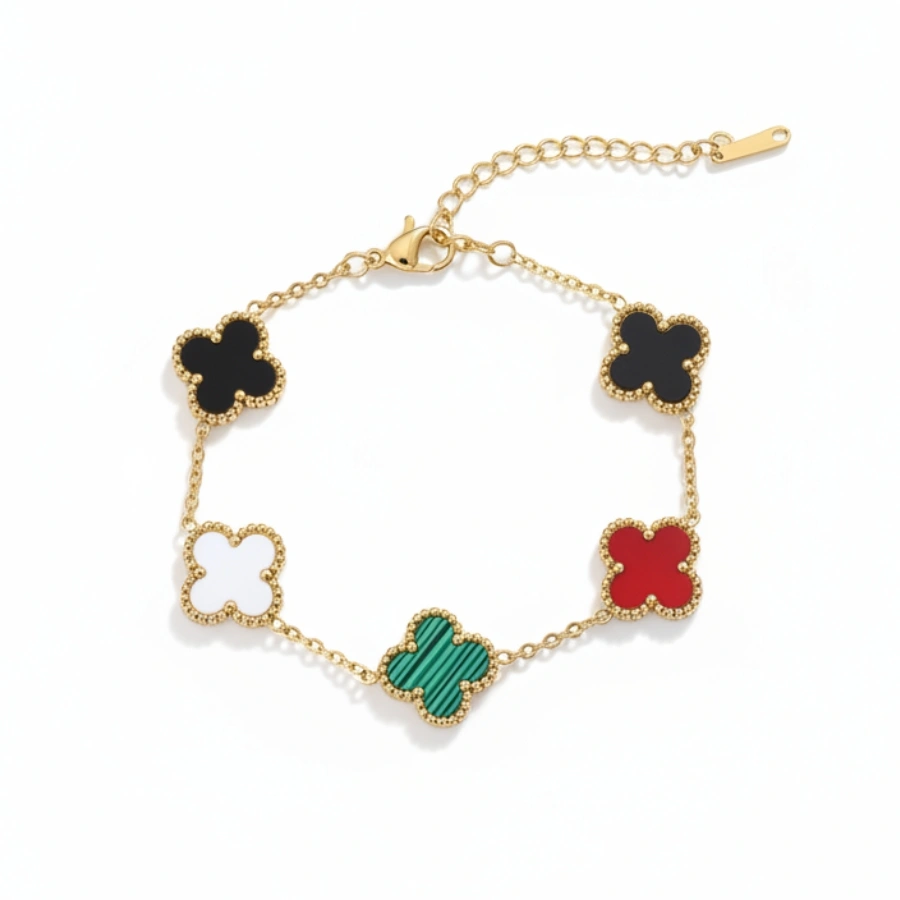 Introducing our elegant anti-tarnish 18k gold-plated stainless steel bracelet, the perfect blend of sophistication and functionality. This bracelet features vibrant, multi-colored clover charms that add a playful yet refined touch to your outfit. Meticulously crafted, it complements both everyday wear and special occasions, ensuring you make a statement wherever you go.