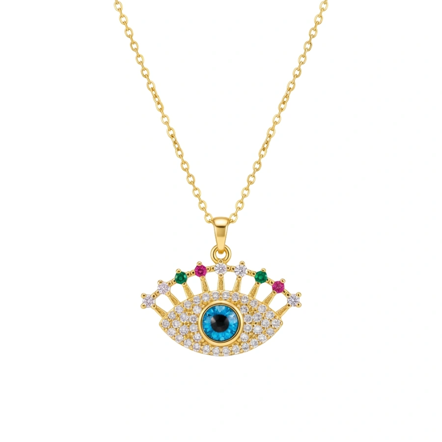Shield your energy with this anti-tarnish 18k gold-plated stainless steel evil eye necklace featuring vibrant multi-colored cubic zirconia lashes and waterproof, hypoallergenic properties for a stylish and protective spiritual look.