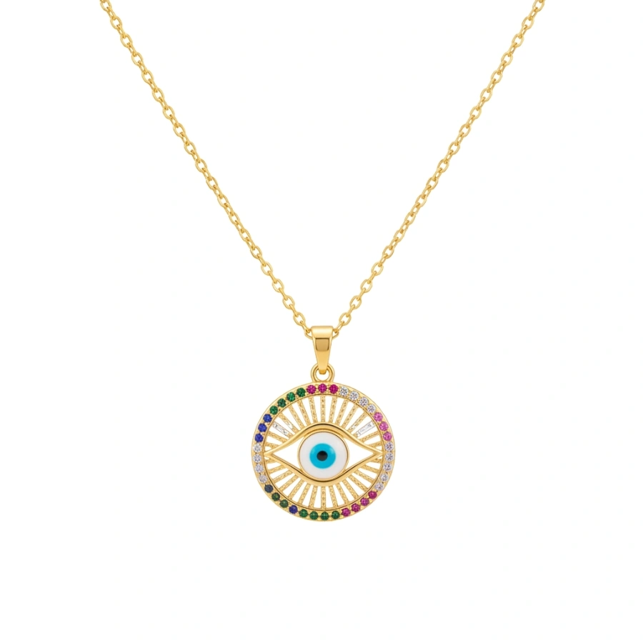 Embrace protection and elegance with our 18k gold-plated stainless steel necklace. Designed for your everyday wear, this anti-tarnish piece ensures you look radiant while safeguarding your energy. The intricately crafted radiating sun pendant paired with the iconic evil eye motif brings a harmonious balance of fashion and symbolism to your collection.