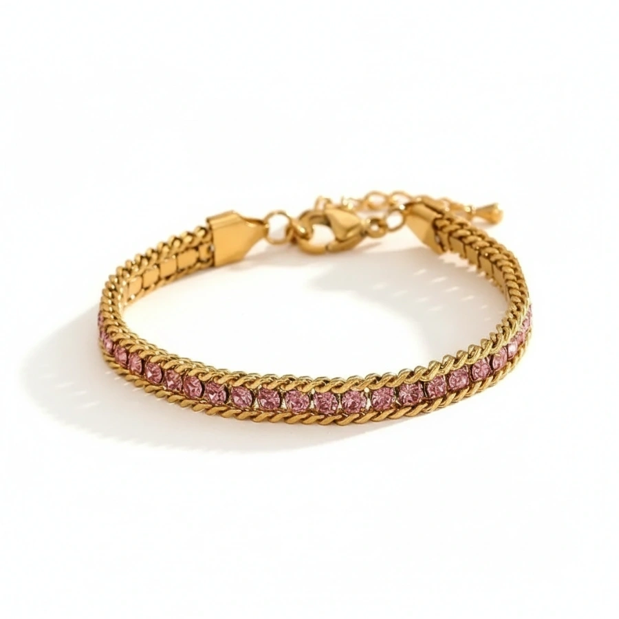 Elegant anti-tarnish 18k gold-plated stainless steel bracelet featuring sparkling pink zircons on a wheat chain for a waterproof, hypoallergenic, and luxurious everyday look.