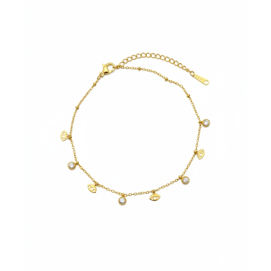 Featuring protective evil eye charms and sparkling crystals on an anti-tarnish gold-plated stainless steel chain, this waterproof, hypoallergenic piece adds a radiant symbolic touch to your everyday style.