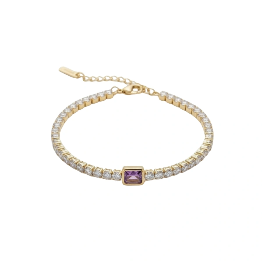Elevate your style effortlessly with this stunning 18k gold-plated stainless steel tennis bracelet. Designed with a sparkling amethyst baguette centerpiece, this accessory epitomizes elegance while seamlessly enhancing your daily ensembles. Whether you’re attending a formal event or adding a touch of refinement to casual looks, this bracelet is your go-to staple for versatile luxury.