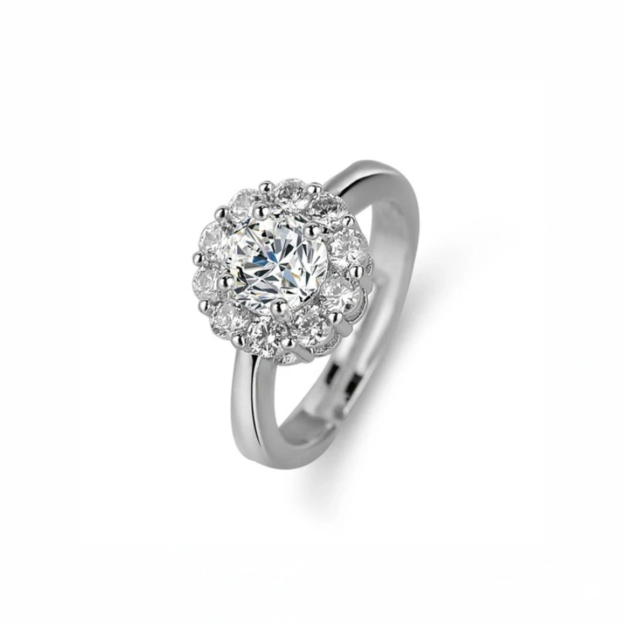 Elevate your jewelry collection with this stunning adjustable silver-plated stainless steel ring. Featuring a meticulously crafted flower halo design, this ring exudes grace and sophistication. The centerpiece—a brilliant, radiant stone—is surrounded by shimmering cubic zirconia accents, offering a luxurious sparkle that complements any outfit or occasion.