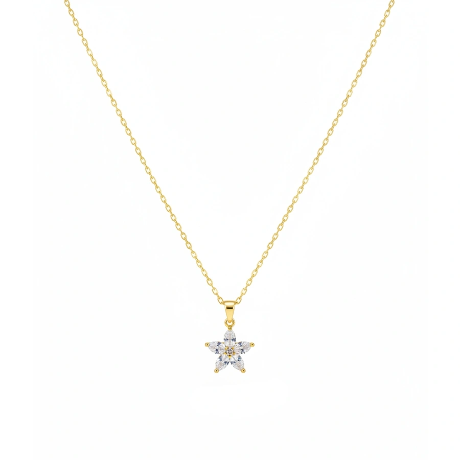 Shine bright with this anti-tarnish 18k gold-plated stainless steel necklace featuring a sparkling jasmine flower crystal pendant for a waterproof and hypoallergenic luxury look.