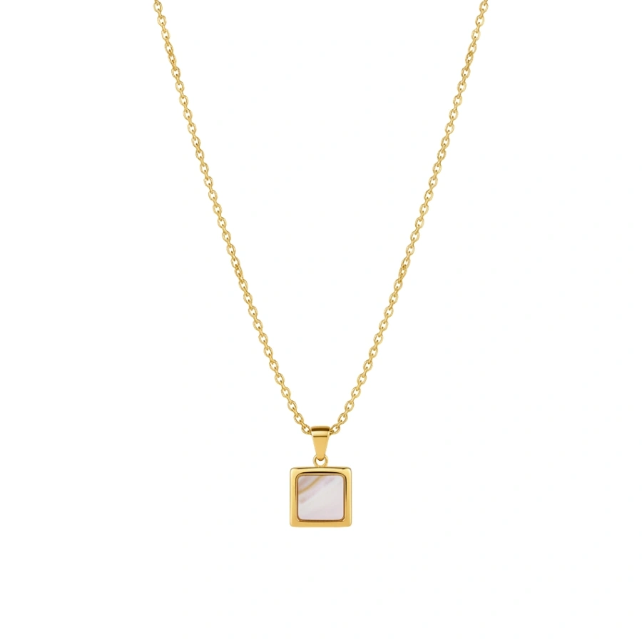 Featuring a lustrous mother of pearl inlay, this anti-tarnish 18k gold-plated stainless steel necklace offers a durable, waterproof design with a sophisticated geometric square pendant.