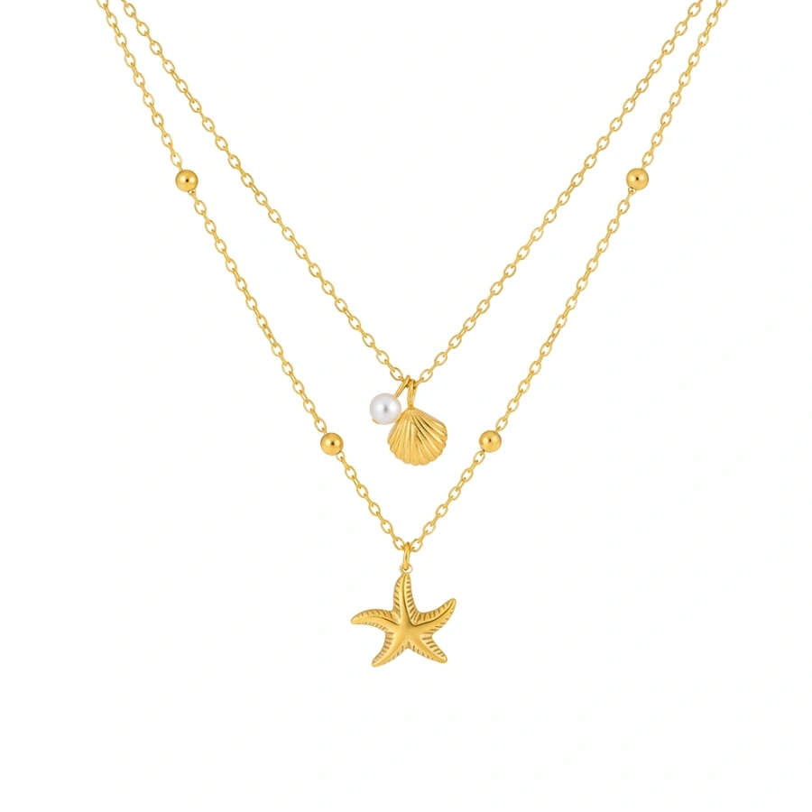 Elevate your style with this stunning 18k gold-plated stainless steel layered necklace, designed to capture the essence of beachside beauty. Featuring charming starfish, shell, and pearl accents, this piece is perfect for anyone craving a touch of ocean-inspired elegance in their everyday or vacation wardrobe.