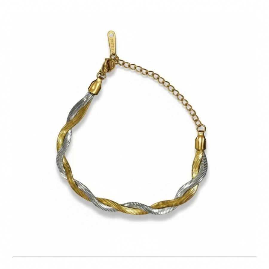Elevate your wrist game with this exquisite two-tone twisted bracelet crafted from 18k gold-plated stainless steel. Its sophisticated design exudes timeless elegance, perfect for enhancing both casual outfits and formal ensembles. Whether you’re dressing up for a special occasion or accessorizing your everyday style, this bracelet delivers unmatched sophistication and charm.