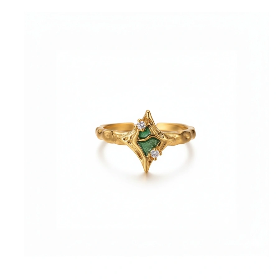This unique anti-tarnish 18k gold-plated 304 stainless steel adjustable ring features a vintage-style green enamel starburst design for an elegant bohemian look.